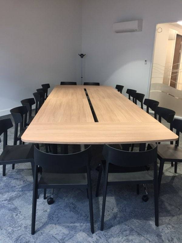 Dès le premier jour, nos équipes ont monté les 8 bureaux de direction avec précision : plateaux de 180 cm, caissons alignés, passages de câbles intégrés. Le deuxième jour était consacré aux salles de réunion : montage des 3 grandes tables modulaires de 400 cm, installation des 36 chaises et fixation murale des armoires hautes avec chevillages renforcés.